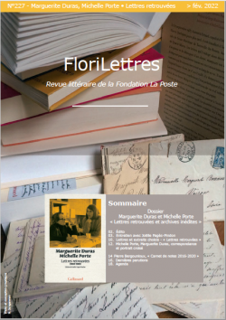 Édito février 2022. Par Nathalie Jungerman Entretien avec Joëlle Pagès-Pindon. Propos recueillis par Nathalie Jungerman Lettres et extraits choisis - Marguerite Duras, Michelle Porte Michelle Porte, Marguerite Duras. Correspondance et portrait croisé. Par Corinne Amar Pierre Bergounioux, Carnet de notes 2016-2020. Par Gaëlle Obiégly Dernières parutions, édition février 2022. Par Élisabeth Miso et Corinne Amar Agenda février-mars 2022 Télécharger FloriLettres florilettres-227 (pdf)